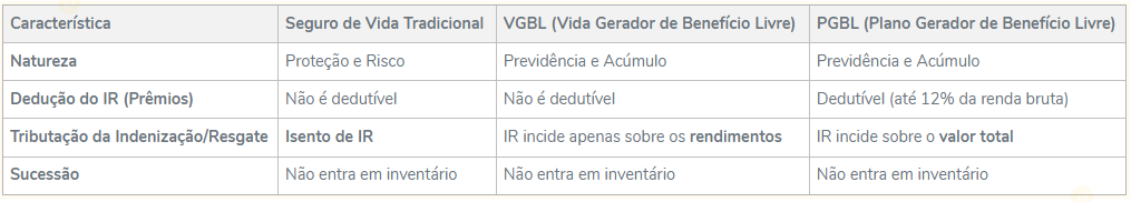 Grande parte da confusão sobre a tributação do seguro de vida surge da comparação com os planos de previdência privada, como o PGBL (Plano Gerador de Benefício Livre) e o VGBL (Vida Gerador de Benefício Livre).
